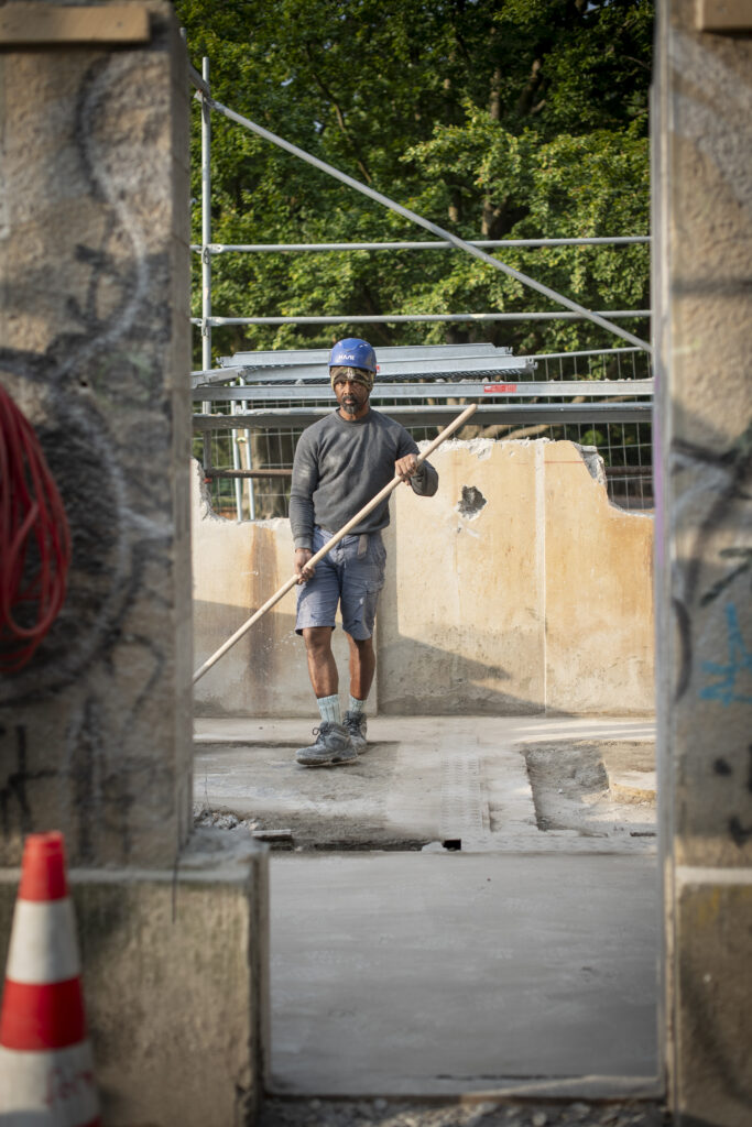 En documentant tour à tour la construction du pavillon de la “Buissonnière” avec les jeunes des Ateliers ABX, les actions de médiation accompagnant l’étude de faisabilité du site de Porteous à Vernier, ou les mutations du Parc des Franchises aux côté des entreprises de génie civil et de paysagisme, tout en y investissant mon énergie et mon savoir-faire, j’ai le sentiment de faire temporairement partie de ces microcosmes et que cette documentation prend un sens d’archivage social. Ce terme désigne pour moi la double intention de documenter la progression du bâti, son déploiement sur le territoire, mais également l’implication humaine, la diversité de celle-eux qui œuvrent, de leurs apport singuliers, spécifiques et pluriels.